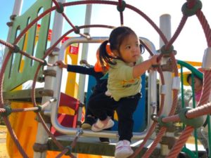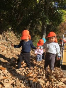 乗り物で遊んだ後は、近くの消防署までお散歩に出掛ける事に。手を繋ぎ準備は万端!歩き進めて行くと、道は落ち葉の絨毯!みんなカサカサと鳴る音を楽しみながら歩いていました。遠くの方に救急車が見えてくると「きゅうきゅうしゃー!」とみんな大好き救急車。その場に座ると「ひかってないねー」「うごかないねー」とじーっと観察しています。すると・・・みんなの気持ちが届いたのか、訓練で乗っていた救急隊員の方がライトをつけてくれました!ぴかぴかと光る赤いライトにみんな大興奮!「ぴかぴかだね~」と本物の救急車を間近で見て大満足な子どもたちでした。