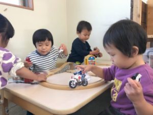 工具のおもちゃや、ブロックを使い遊んでいると遠くの方から救急車のサイレンの音が聞こえてきました。「あ!きゅうきゅうしゃー!」嬉しそうにまだかな?まだかな?とソワソワ、ワクワクしながら道路が見える窓の付近へ行き救急車が通り過ぎる様子を眺めています。目の前を救急車が通り過ぎて行くと「きゅうきゅうしゃー!!!」と満面な笑顔でぴょんぴょん飛び跳ねながら喜んでいました。そんな様子から、お部屋に乗り物の写真カードを掲示してみる事に。すると早速カードに気が付いたお友だち。「これと、これとこれ!」と好きな乗り物のカードを手に机の上を走らせながら楽しんでいます。そんな様子に気が付いた周りのお友だちも真似っこ。木製レールを繋ぎ合わせ、トンネルを作るとその間を勢いよく「ピーポーピーポー」「とおります!」と救急車や消防車・パトカーなど大忙し!!「はたらくくるーま~♪」と楽しそうな歌声とともに乗り物に夢中な子どもたちでした。