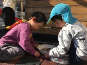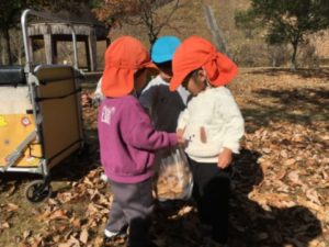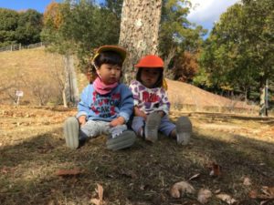「おっきいのあったー」と落ち葉拾いに夢中なお友だち。