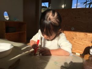 園庭で遊んでいると、ひらひらと枯れ葉が風にのって園庭に迷い込んできました。枯れ葉を拾うと「はっぱー!」とにっこり嬉しそうに手に持っています。そんな様子を遠くから見ていたお友だちも「○○くんも!」と枯れ葉探しが始まりました。フェンスの隙間を見てみたり、地面に敷いてあるタイルの動かしてみたり。「あったー!!」「ここにもある!」と気が付けばトレーいっぱいに枯れ葉が集まりました。子どもたちが園庭で集めた枯れ葉を何かに使えないかなと、お部屋に持って行き机の上に並べてみる事に。早速、枯れ葉に気が付いたお友だちは「はっぱおっきいね~」「これ○○ちゃんがとったの」と嬉しそうに眺めています。そんな中、隣では保育士が枯れ葉にこっそりある仕掛け。ペンで顔を描いていると・・・「おじいちゃんはっぱだ!」「○○ちゃんもかきたい!」早速こんな声が聞こえてきました。ペンや絵の具、シールなどのアイテムを並べ準備してみると、好きな物を手に取り真剣な表情で顔を描いたり色を塗ったりしていました。「ピンクにするの」「みどりにする!」と色を塗ると完成!「みて~おじいちゃんはっぱみどりになった!」と仕上げにシールをペタリ!カラフルな素敵な葉っぱが沢山出来上がっていました。