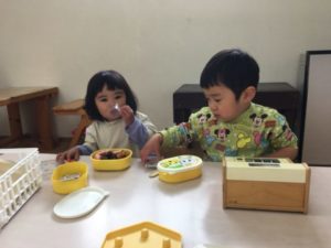 お部屋の中では大きな紙に道路や線路を描いてみると、一緒においてあったラミネートしたいろいろな車を走らせたりして楽しんでいました。ミニカーでは何人かでミニカーを持ち「ブッブー!」と言いながらひたすら机の上を走らせていました。遊びが展開されるかなと思い、レールを出そうかな?と迷いながら見ていたのですが、あまりにもお友だち同士でお話しながら楽しそうに遊んでいたので思わず見入ってしまったほどです。一方の机ではお正月のイラストを用意してみました。主におせち料理の絵で、丁寧にクレヨンで色を塗りそれを切ってお皿のイラストに貼ったりして遊んでいましたよ。もうすぐくるお正月のことがわかっているのかはわかりませんがイラストのお豆はわかったようです!