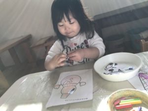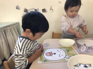 「めめピカピカね!」塗り終わったゆきだるまさんの福笑い!