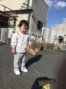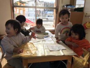 ここ最近、朝のおやつの人気がありません。おもしろい遊びをもっと続けたい!朝ごはんでおなかがいっぱい、などなど子どもたちにも理由はありそうなのです。どうしたら食べてくれるかなぁと私たちも少し考えて、いつもとは少し違うおやつにしてみました。エプロンと三角巾、手袋をつけて準備しているの様子を知ったこどもたち、「何だ?なんだ?」と興味深々な様子で傍にやってきました。ランチルームの机には、まな板とオレンジが置いてあります。これは何かが始まる!子どもたちは急いで手を洗いテーブルに来てワクワクしています。保育士がオレンジを包丁で切るところをジーっと観察。パーンとオレンジが半部に切れると、思わず「おいしそー」と声が上がっていました。食べたくてしかたない様子。みんな良い表情でおいしそうに食べてくれて完食しました。ちょっとした工夫でこんなに食べてくれるんだなぁと嬉しくなりました。おやつを食べ終えた子から好きな遊びを見つけ遊び始めました。お正月遊びの福笑いを置いておくと、気が付いたお友だちが、「あ~!これおかおないねー!」「おめめつけたいー!」と目や口など顔のパーツを手に取って並べ始めました「ニコニコになった!」「なんかおめめ、こうなったよ~!」と言いながら福笑いと同じような表情を真似している様子がとても可愛らしかったです。またお部屋に飾られてた凧を見つけ、昨日挑戦した凧あげを思い出したようです「たこするー。」と言い、急いで帽子を被り、靴を準備お外に喜んでかけて行き、保育園の横の駐車場で安全に十分気を付けながら、元気いっぱい凧あげを楽しみました。