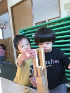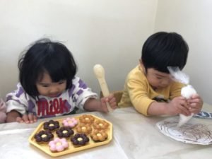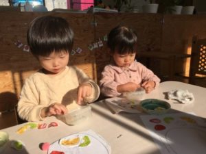 食べ物のおもちゃが机の上にあるのを見ておままごとが始まりました。お弁当箱の中のいろいろな食べ物を交換して遊ぶ姿があったり、「これどうぞ~。」と言ってあげたりして楽しんでいましたよ。そんな中、ショートケーキを見つけ「ケーキだ!」と声が聞こえてきて、「サンタさんのとき食べたよ。」「丸いの食べた。」などと会話が始まりました。そんな会話を聞きながら、フルーツのイラストやケーキのイラストを用意してみましたよ。「赤ちょうだい!」と言う声や「かきかきかして~」など言いながらお絵描きを楽しんだり、はさみを使っていちごやみかんなどの線にそってきれいに切り丸い紙の上に並べていました。そっと糊を用意してみると、それに気づきペタペタと貼り、その周りにはキラキラした紙などを貼ったりして飾り付けていました。ストローを見つけてろうそくに見立てて「フー!」と。お友だち同士の「フー!」の連発で笑い声が響いていましたよ。ストローが倒れてしまうのを見て保育士が「穴開けようかなぁ~」と呟いてると、「〇〇があける!」とはさみでうまくあけていました。ストローがうまくさせたときはとても嬉しそうでしたよ。一方、「クリーム!」という声もあったのでクリームも用意してみると、ドーナツのおもちゃや自分で色を塗ったケーキのイラストにクリームを絞っていました。手つきは立派なパティシェでしたよ。次はどんなケーキができるか楽しみですね。