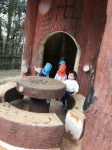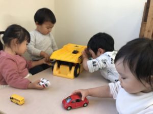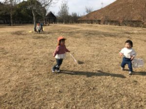 遊んでいると「のりもののおもちゃがしたい!」と言う声が聞こえて来たので、子どもたちと一緒に準備してみると、さっそく手に持って走らせる様子や、大きな車の荷台にお友だちの持っていた小さな車を一緒にのせてあげたり「いっしょにしよ~!」と、仲良く遊ぶ姿が見られました。また、お部屋に置いてあった凧を見つけ、持ち手を握りお部屋の中で凧を引っ張っている子がいました。外へ凧を持って行くと「やるー!」っと意気込んでいる子どもたち。十分に安全に配慮し、園庭横の駐車場で凧揚げを楽しんでいました。お部屋にいた子どもたちも園周辺施設が載っている地図や公園内遊具の写真カードがを手に「あー、ここいきたいなぁ」っと子どもたちから聞こえてきます。子どもたちのリクエストに応え、お散歩に出掛ける事に。子どもたちが大好きな凧も持って出発です。公園までの道中、大きなダンプカーに驚いたり、サイレンを鳴らし大急ぎで走っていく救急車に手を振る子どもたち。更に歩き進め公園に到着!持ってきた凧をカバンから出していると「あこ、やるー!」っと意気込んでいました。持っていった凧を手に「ビュ~ン!」と言いながら一生懸命走る姿が何ともかわいらしかったです。公園内にある階段にも挑戦!!みんな階段をどんどん先まで登り、頂上からの眺めを楽しんでいました。登った先でどんぐりや葉っぱを見つけ大事そうに握りしめている子の姿も見られました。公園内で見つけた大きな葉っぱを「おうちにもっていくの!」と、園に戻って来るまで大事そうに抱えていました。途中、落とす事なく持って帰ってこれたのです!その葉っぱ、鞄の中にしまう子どもの姿を見ていて、まるで宝物をしまうようで子どもらしくこちらが心にグッと来て、とても幸せな気持ちになりました。