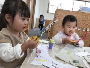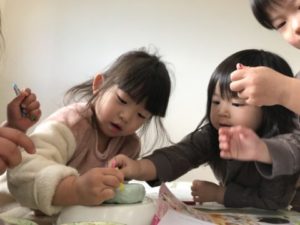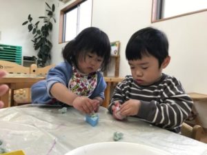 誕生日ケーキで大盛り上がりだった昨日。今日も登園してきた1歳児の子がブロックを何段にも積み上げ「ハッピ~バースデ~トゥ~ユゥ~♪」っと歌い楽しそう。2歳児の子も「きのう、ロウソクふ~ってしたね~」っと友だちと会話が弾んでいる姿がありました。子どもたちのこのような姿からケーキに関するアイテムを少し準備してみる事に。ケーキのカタログを見つけると「どれにしよっかなぁ~?」「〇〇ちゃんはいちごいっぱいのケーキがいい!」「△△くんはどれがすき?」などと、2歳児の子は自分の好きな物を伝え、友だちの好きな物も聞いている様子が見られ、そんな姿にとても成長を感じます。大きな紙を用意し、ペンで描き始めると「なになに?」っと子どもたちが集まって来ました。描いている絵を見て「ケーキじゃん!」「いちごは?」「いちごないね~」っと。いちごを1つ描いてみると「ぬりぬりしたい!」「ぬりぬりかして~」っと子どもたちから聞こえて来ました。クレパスや水性ペンを用意すると丁寧に色塗りをしたりダイナミックに描いたりと子どもたちはそれぞれに楽しんでいます。前日に遊んだ粘土で作った土台を用意し蓋をつけ子どもたちの目の前に置いてみました。蓋を開けると・・・そこには粘土で作った立体的な土台が。それを見て「ロウソクがない!」「ロウソクちょうだい!」と子どもたちからリクエストがあり、ロウソクを用意してみました。5本あったロウソクだけでは物足りない様子。「もっとちょうだい!」そんな声にモールを出してみると「ハサミちょうだい!」と。ハサミを渡すとモールを一生懸命切っていました。短くなったモールを粘土の土台に挿し「むらさきになっちゃった!」と紫のモールが粘土の土台に立っていました。暫くロウソクやモールを粘土の土台に立てて楽しんでいたのですが・・・1人の2歳児の子が粘土の土台に水性ペンのキャップを挿し丸い跡が付くのを楽しんでいると、周りの子も真似をし丸い型を抜いていたので色々な形の型を出してみました。すると・・・型を取る子や型の中に粘土をギュッ!!っと詰める子、円すい状の型の上に粘土を乗せ「アイスクリーム、できたー!!」っと見立てて遊ぶ子など子どもたち1人1人が色々な遊びを編み出していました。子どもたちは遊びの天才!粘土でも色々な遊び方があって面白いなぁ~っと気づかされました。子どもたちは柔軟な考えで面白い遊びを作り出す天才ですね。