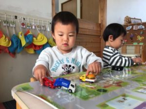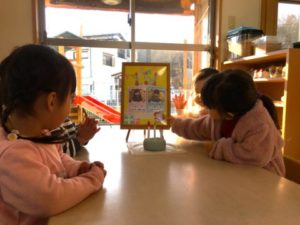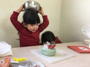 お部屋の棚には、毎月お誕生日のお友だちの写真が飾ってあります。そんな写真に気が付いたお友だち。「あ!○○ちゃんと○○くんだ!」と嬉しそうに棚の上を眺めています。子どもたちが見えるように机の上に置いてみると「おたんじょうびだね~」「3さいになるの!」「あとちょっとでおっきくなるの!」と楽しそうな会話が次々に聞こえてきました。「ケーキもあるね~」「おいしそうだね」とケーキやお誕生日写真のお話しでさらに盛り上がっている中、一人のお友だちが「ハッピバースデ~♪」と歌い始めました。すると歌に合わせて周りのお友だちも手拍子や拍手!残念ながら今日は、誰のお誕生日でもありませんでしたが、お誕生会ごっこは大盛り上がりでした。そんな子どもたちの様子を見ながら、別の場所にはケーキの写真カードやボウル・泡だて器・絞り袋などを準備してみました。「あ!やりたい!」と早速手に取ると、お友だちと和帽子を被せ合い気分はパティシエです!紙や粘土で作ったケーキの土台に、真剣な表情でろうそくを差し始めるお友だち。更には、ラミネートしたいちごの写真カードを土台に差し込むと・・・「ケーキできたよ~!」と、銀のボウルを完成したケーキに被せ・・・ぱかっ!と開けると「じゃじゃーん!」何度も蓋をして開けてを繰り返し、お友だちに完成したケーキを見せる事を楽しむ子どもたちでした。