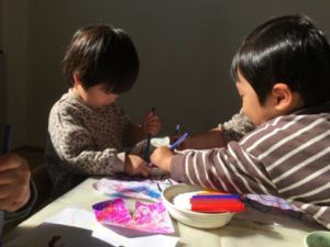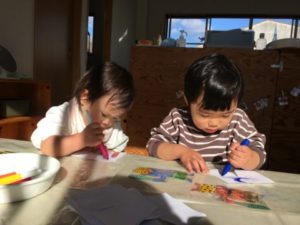 最近子どもたちが興味を示しているのは節分の鬼。お部屋に飾ってある巨大鬼のイラストを見て「おにさんいた!」「こわいよー」と鬼の前を通ってみたり、鬼のカードを見て「おにさんパンツはいてるね~」「○○ちゃんもはいてるよ!」とパンツに興味を示したり、お友だち同士楽しそうな会話が次々に聞こえてきます。そんな楽しそうな声から、鬼のカードに合わせて鬼のパンツのカードを作ってみる事にしました。保育士が黙々とパンツを切って作っていると・・・遠くから見ていたお友だちが椅子に座り、何が出来るのだろう?とワクワクしながら見ています。少しずつパンツが完成してくると「わぁ~おにのぱんつ!」と嬉しそうな表情!「あかのぱんつがいいの」「○○ちゃんはきいろのぱんつ!」と鬼のパンツに大盛り上がりです。鬼のカードに好きな色や柄のパンツを照らし合わせると「はけたよ~」と嬉しそうにお友だちと見せ合っていました。パンツで遊び終えた後は「パンツつくりたい!」と子どもたちのリクエストから絵の具やペン・クレヨンなどを使いパンツ作りに挑戦する事に。黙々と色を塗る中で「これとこれまぜまぜするの」「いろかわるんだよ」と色の変化に気が付くお友だちの姿も。「つぎこれとこれ!」と様々な色を組み合わせ色を作りを楽しみながら、カラフルなパンツが出来上がっていました。お部屋で遊んだ後は、園庭で元気いっぱい走ったり遊具に登ったりして体を使って遊んでいます。そんな中、鬼のお面を置いてみたらとこっそり準備してみると、早速身に着け鬼になりきる子どもたち。「おにだぞーーー!」と追いかけるお友だちもいれば、こっそりお友だちの背後へ行き「わぁ!」と驚かすお友だちも!「きゃー!!こわいよー!」と逃げたり追いかけたりとっても楽しそうに遊んでいました。