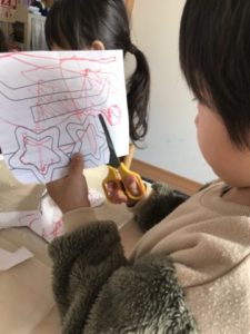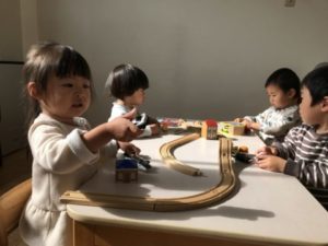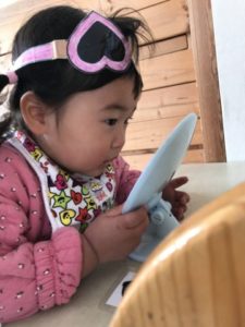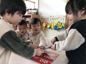 子どもたちが園庭での遊びに夢中になっている間に絵本棚にあった絵本の入れ替えをしてみました。それを園庭から窓越しに子どもたちがじーっと見ています。子どもたちが「なになに?」と興味深げにお部屋へと戻ってきました。絵本の棚にあった絵本の中に「めがねがね」と言う絵本があり、それを手に取り表紙を開いて「どのめがねがいい?」と絵本を囲みながら話しています。そこへちょっと仕掛け。保育士がめがねを掛けてみることにしました。何も言わずこっそりとめがねを掛けて部屋の中を歩いていると「めがねやん!」と。「せんせいのめがねなん?」と聞いてくる2歳児もいます。絵本の中に載っている様々なデザインのめがねを指差しし「このめがねがほしいの・・・」と伝えに来た子がいました。その姿から紙に子どもたちからリクエストのあっためがねのイラストを紙に描いてみると・・・「かきかきしたい!」「ぬりぬりかして~」と更なるリクエスト。描いたり、塗ったり出来る様にクレパスや水性ペンなどお絵描きが出来るアイテムを渡してみました。箱に入ったままクレパスを渡してみました。「けんかになるかなぁー?」なんて思ったのですが子どもたちの様子を見守ってみる事に。すると・・・取り合いになること無く「はい、これいいよ」などと言いながらお友だちに譲ってあげています。そんな姿にとっても成長を感じ、見ていて嬉しくなりました。別の場所では救急車のサイレンが聞こえて来ると一斉に外を見渡せる窓越しへ大移動。サイレンを鳴らし走り去っていく救急車を見ることができ、それはもう大興奮。そんな様子から救急車や消防車など働く車に関するアイテムも用意してみました。働く車の写真カードとミニカーを照らし合わせ「これ、いっしょだよ、あとかー(パトカー)」っと言い友だちに声を掛けている子の姿も見られ、今日は働く車とめがねで大盛り上がりの1日でした。ちなみにカラーセロハンを挟み実際に掛けられるようなめがねも用意してみると・・・子どもたちそれぞれが好きなデザインのめがねを選び、実際につけている姿がなんとも可愛らしく、思わずクスッと笑ってしまうようなシーンも見られました。
