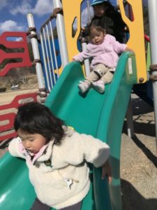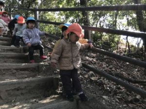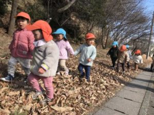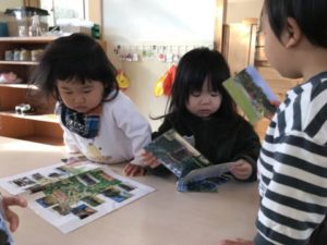 子どもたちが元気に園庭で遊んでいる間にちょっと仕掛けをしてみる事にしました。その仕掛けとは・・・園周辺施設の地図や写真カードを机の上に並べておいて置く仕掛け。お部屋に戻ってきた子どもたちから「わぁ~!!」っと歓声が上がりました。園周辺施設や公園、公園内の遊具の写真カードをラミネートしカードのようにし1つにまとめリングを付けた物を1枚ずつめくり「ここいきたい!」「ここ、ママといっしょにいったんだよ」と友だちと会話をする様子も見られます。子どもたちが数人集まってリングに付いた写真カードを見ているのですが・・・子どもたちそれぞれがみたい写真が違う様子。さて、どうするのでしょう。暫く見守っていると・・・2歳児の子がリングを外し、写真カードをお友だちに渡してあげています。リングは保育士が預かり、写真カードはそれぞれの子どもたちへ。2歳児の子がリングを外してくれた事でケンカが起ることはありませんでした。凄いですよね。このような姿に毎日驚かされるばかりです。写真カードを保育士の所へ持ってきて「ここいきたい!」「ここいこうよ~!」っと伝えにやって来ました。子どもたちからリクエストのあった場所へ出発!公園内を歩き進めていくと「おばけのおうちー!!」と。公園内にある建物を何故か「おばけのおうち」と言う名前が付いたようです。別の子からは「せんせいのおうち」なんていう面白い声も。この言葉に思わずクスッと笑ってしまいました。公園内の階段を登ったり、降りたりにも挑戦です!慎重に・・・慎重に・・・挑戦していました。風の強い日でしたが子どもたちは元気に公園内を走り回ったり、遊具を楽しんだり。時には被っている帽子が風で脱げてしまい「あー!ぬげちゃったー!」と被り直し、他のお友だちの帽子も被せてあげたりとステキな一面も見られました。