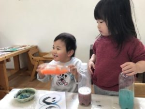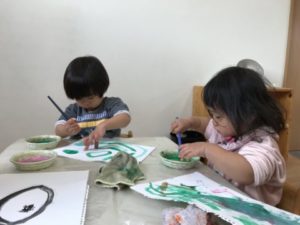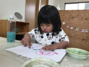 昨日も遊んだ色水のペットボトルを持ってきて「やりたい!」という声から絵の具をトレーに出すと筆を渡す前に自分の指で紙にぬりぬりが始まりました。これはおもしろいと思いながら様子を見ていると、他の子も真似をしてやり始めました。何色か使って描いている様子はまるで芸術家のようでしたよ。後半にそれらを自由に切って遊んでいた際に出来た物はなんとパンツ!「おにのパンツだよ!」と教えてくれました。本当にパンツの形になっていてそれを見せ合って笑い合っている姿を見てほっこりした気持ちになりました。