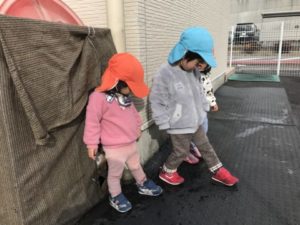 園庭では水たまりを発見して足でぴちゃぴちゃ!今日は晴れたり雨が降ってきたりで中に入ったり出たり・・・強い風が吹いてきて「キャー!」と歓声をあげ、帽子が取れたり髪の毛がボサボサになったりしたのを楽しんでいた子どもたちでした。
