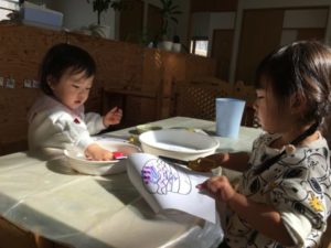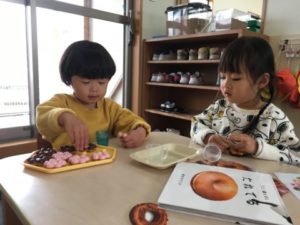 別の場所では、密かにブームになってきているハンバーガーのおもちゃ。ハンバーガー屋さんの帽子を被り今日も「いらっしゃいませ~」とハンバーガー屋さんの開店です。ハンバーガーを積み上げたり、ボウルの中でポテトをぐるぐると混ぜてみたり。中には「これじゅーってするの」とおもちゃのフライパンの上にバンズやお肉を置くと「じゅ~!」と焼いているお友だちの姿も。「できた!」と完成したハンバーガーをトレーに置くと「あ!おちゃわすれてた」とペットボトルに入った水をお茶に見立て「あたたかいおちゃいれますね~」とコップに注ぎ、お茶とハンバーガーのセットが完成!「おいしいね~」と美味しそうに食べる真似をしてハンバーガー遊びを楽しむ子どもたちでした。
