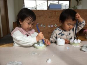 園庭を見渡すと一面真っ白な雪でいっぱい!子どもたちも「ゆきだー!」と外の様子に興味津々です。下駄箱から靴を取り出し帽子を被り、園庭へ行く準備は万端でしたが、生憎の大雪で外には出られず残念そうな子どもたち。そんな子どもたちの様子から少しでも雪に触れる事が出来たらと、バケツいっぱいに雪を入れてお部屋に準備してみる事にしました。雪でいっぱいのバケツを運んでいると「わぁ~ゆきだ!」と早速気が付いた子どもたち。カップに雪をいっぱい詰めてみたり、スプーンでサクサクと混ぜてみたり。中にはギュッと握りしめ雪の感触を楽しんでいるお友だちもいます。そんな中「オレンジしたいの」「○○ちゃんはあか!」とこんな声が聞こえてきました。以前雪遊びをした際に色を付けて遊んだことを思い出したようです。子どもたちの声から、絵の具を用意してみると「○○くんこれ!」と好きな色を選び、雪の上にちょんっとのせるとぐるぐるまぜまぜ。お友だちの雪とも混ぜ合いながら「いろかわった!」と色の変化を楽しんでいました。