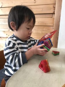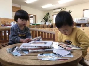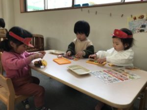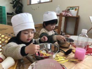ここ数日、子どもたちの中ではハンバーガーブームがやって来ています。ハンバーガーの玩具を高く積み上げ「ほら!できた。たかいよ」と、バンズやお肉、チーズ、レタスなどをバランスよく積み上げていくなかなか難易度のある玩具なのですが、子どもたちは器用に絶妙なバランスでたかーく積み上げています。それでも時折バランスを崩し積み上げたハンバーガーが崩れてしまうこともあるのですが、子どもたちは何度も積み直し「なおった!!」と嬉しそうに教えてくれます。ハンバーガーの写真カードやメニュー表を用意してみると・・・それらを囲んで「これがいい!」「ハンバーグがすきなの」「これ、ママとたべたよ」と楽しそうに話す子どもたち。2歳児の子は「〇〇ちゃんはどれがいい?」とお友だちが好きな物を聞いている姿が。自分が好きな物を伝え、友だちの好きな物を尋ね・・・言葉でのやり取りがあちらこちらで見られる様になり、このような姿を見ていると、とても成長を感じますね。ハンバーガーの玩具に加え、ボウルやフライ返しなど更なるアイテムを準備するとそこから遊びが次々と発展していき「いらっしゃいませ~」「どれがいいですか~?」「ジュースくださ~い」こんな可愛らしいやり取りが聞こえてきます。「ジュース・・・。」の声に水の入ったペットボトルを机の上に置いてみました。すると・・・「いろがない!」「ピンクがいい!」と子どもたちからリクエスト。リクエストがあったピンク色の絵の具をペットボトルの中にポタリ・・・。子どもたちはペットボトルをシャカシャカ振っています。みるみるうちにピンク色の色水が出来上がり「ピンクのジュースくださ~い」「ここにいれてくださ~い」とまるで本物のハンバーガーショップの様で、見ているこちらもワクワクして楽しい気持ちになりました。来週はどのような展開になるのか・・・お楽しみに!