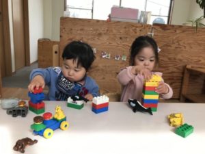 「きいろ!」「あか!」と色を言いながらブロックを積み上げています。様々な色が聞こえて来ました!
