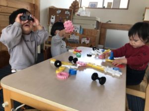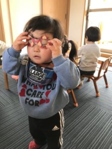 いつもいろいろな事に興味を示し活動しているこどもたち。玩具が少しいつもと変わっているのを見つけた子どもたちは「これしたい!」と、棚から玩具を机の上に持ってきて広げています。アイスクリームの玩具を並べ、メニュー表と見比べながら「これはチョコ」「ピンクはいちご」「こっちはメロン」など色でアイスクリームの味を想像している子どもたち。そんな子どもたちが保育士の所へやって来て「どれがすき?」とメニュー表を見せに来てくれました。「ん~、なやむ~。どれにしようかなぁ~?」っと答えてみると「これにしたら?」とオススメしてくれました。そのオススメされたアイスクリームはピンク色のアイス。「〇〇ちゃんといっしょだからこれにしたほうがいいよ」と。オススメの仕方があまりにも上手でまるでテレビショッピングのよう。思わず「じゃあ、それにしよっかな!」っと答えてしまいました。別の場所では井型ブロックを長~く繋げたり、高く積み上げたりと工夫し遊んでいる子もいます。井型ブロックの中に丸い形のブロックがあり、この丸い形を2つ手に取り「めがねみたいだよ」っと見立てて楽しんでいる子がいました。「なるほど~、お!めがね、いまだ!!」っとカラーセロハンを挟んでラミネートをした実際に掛ける事が出来る例のおもしろめがねを出してみました。いつものめがねとは違うデザイン・・・。そうです!新作のめがねのコレクション。いつもとは違うデザインと形に子どもたちはもう虜。掛けたり、外したりし視界の色が変わるのを楽しんでいました。遊んでいる子どもたちの様子を見ていると言葉でやりとりしている姿をあちらこちらで見られるようになってきました。このような姿を見ていると「おおきくなったんだなぁ~」「すごいなぁ~」っと感慨深くなります。子どもたちの成長が嬉しい限りです!