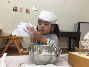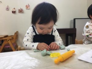 ブロックで遊び終えた後は、連日盛り上がっているクッキー作り。「ここにこむぎこいれるの」「まぜまぜするんだよ」「クッキーできてきた!」と小麦粉に水を入れ小麦粉粘土作りに挑戦中。「これほしい!」「ころころするの」と何度か型抜きをしている事もあり、慣れた様子で麺棒を転がし粘土を伸ばすお友だちや「ハートできた!」とハートの型を押し当てくり抜いたり。机の上には様々な形の粘土クッキーが出来上がっていました。