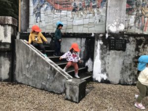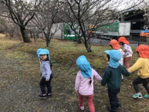 以前園の周りを散歩しているときに花壇を見て「お花咲いてるね!」と言っている様子がありました。今日も園庭から梅の花が咲き始めているのが見え「お花咲いてるよ!」と言う声が聞こえてきたので、お花を探しに出掛けてみました。南部丘陵公園に着くと「お花あった!」「きれいだね。」など様々な会話もとびかいゆっくりとお花見です。しばらく歩いてピンクの花を見つけると「ピンクだ!!」と指をさしながら見ていました。まだ咲き始めなのでこれからもっと暖かくなってきてたくさん咲いてきたお花の様子を見たときの子どもたちの反応が楽しみですね。大入道の広場では思い切り走ったりして体を動かしていました。広場に着く前におばけの話もしていた子どもたち。「おばけさーん!いますかー?」とみんなで探す姿はかわいらしかったですよ。