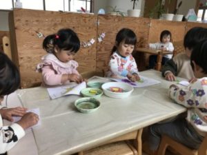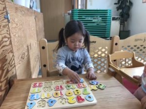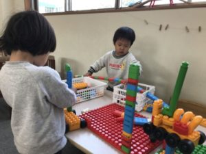 園庭で遊んでいる時に、「パパとママとおすしいったよ。」というお友だちの呟きに、「おすし?」「おすしたべたーい。」会話が盛り上がり始めました。そんなおすしが食べたい子どもたちの声から、お寿司の形に切ったカードやお皿、おすしが沢山載ったメニュー表をそっと準備してみると、「おすしだー!」「これたべたーい」「たまごがいい」と嬉しそうです。最初は「えびー!」と言ったり「おいしー!」と言って食べる真似をして遊んでいましたが、お友だちの1人が「ねえねえ、おすしやさんに行こうよ!」という提案に周りの子もワクワクしたようです。「いいねー!」という声と共に「おすしどうぞ~!」「おかねいります!」とすぐにお寿司屋さんが始まりました。白い和帽子を被りメニュー表を並べて「どれにしますか?」と聞くお寿司屋さんの子や「これにしまーす」とお寿司を頼むお客さん役の子が見られ始めました。「はいこれですね!」「どうぞ~!」と言ってお皿にお寿司を並べていました。「はいおかねです!」お金を渡してレジを打つまねをしていたので、おもちゃのお金やレジスターを準備してみると、レジ役のお友だちもとてもうれしそうになりきっていました。もう少しお寿司屋さんが楽しくならないかなぁとワクワクしながら、即席の回転する台をこっそり作成。子どもたちの前にそっと置いてみると・・・子どもたちはすごくうれしそうに台の上にお皿を並べてくるくる回るお寿司を楽しんでいました。楽しさのあまり、台を回しながら鼻歌を歌うお友だちもいました。別の場所ではパズル遊びやお絵かきを楽しんだり、最近はブロックに夢中になったりしています。ブロックを長く繋げて出来てくるとブロックが入った籠を土台にして今日は道や橋のようにしていました。そして自分で作った車を長い橋の上に置き、そーっと走らせていました。机の上は子どもたちが作った小さな町のようになっていました。