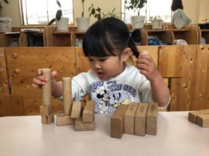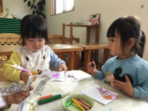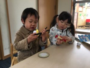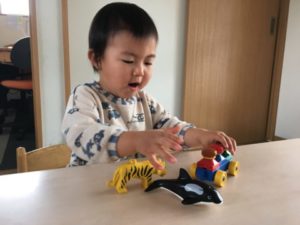 お部屋の本棚から好きな絵本を手に取ると、椅子に座りみんな真剣に見ています。「ばばーん!」「ぼちぼちいこか~」と何度も見ている絵本は少しずつセリフも覚えてきているようです。「つぎこれみる!」「○○ちゃんこれね」と、お友だちと絵本を交換し合いながら見ていると「みて!おすしだ!」と。見ていた絵本の中からお寿司の写真を発見!「おすしおいしそうだね~」「これたべたいな」「マグロすきなの」と気が付けばお寿司の話題で大盛り上がり。「パパとママとおすしやさんいったの」「たまごもたべたの」と、お寿司屋さんに行った事があるお友だちからはこんな声も聞こえてきました。そんな姿を見逃しては!とフェルトで作ったお寿司や、お皿、お箸などのアイテムを準備。早速、お寿司のシャリや具材を手に取ると、和帽子を被り気分は寿司職人。「マグロつくるの」とシャリの上にそっと赤いフェルトをのせ、お皿に盛り付けていました。更には「マグロきるの」とかまぼこの板をまな板に見立て、玩具の包丁をスライドさせながら切ったり、麺棒でマグロを引き延ばしたり。「おまたせしました!」と机には沢山のお寿司が並んでいました。