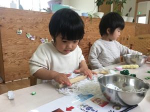 一方別の場所では、密かに盛り上がり始めている”うどん”作り。和帽子を被り、お椀の中に麺に見立てた毛糸を入れるとうどん屋さんの開店です。お玉でぐるぐると混ぜたり、具材を盛り付けたり。うどん作りをしていると「しおと、こむぎことみずでうどんになるんだよ」と呟く声が聞こえてきました。どうやらお部屋に掲示してあったうどんのレシピを見つけた様子。「うどんつくりたい!」「こむぎこほしいの」とこんな声を見逃してはと早速、本物のうどん作りをする時と同じ材料を準備してみる事にしました。小麦粉や塩それぞれの匂いを嗅いだり少し味見をしながらクッキングごっこのスタートです。工程表と睨めっこしながら「つぎおみずいれるの」「ふみふみするんだよ」とまとまった生地を袋に入れ、みんなでこしが出るまで踏みます。生地を細長く切るとうどんの完成!「ながいのできたよ!」と残念ながら食べる事はできませんでしたが、本物そっくりのうどんにみんな興味津々。捏ねたり麺棒で伸ばしたりしながら楽しんでいました。