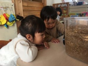 去年の夏に沢山産まれたカブトムシの卵。卵から幼虫に成長し、もうすぐ蛹になる準備を始めている様子。その為、ここ最近虫かごの中の幼虫の姿が見られず少し寂しそうな子どもたち。虫かごを覗いては「いないねー」と言う毎日でしたが、よーく見ていると土に埋もれた幼虫が虫かごの側面から少し見えている事に気が付きました。「あ!ようちゅういた!!」「みてここ!」と久しぶりの幼虫に大興奮。虫眼鏡で拡大しながら観察してみたり、土が少し動くと「みて!うごいたよ」ととっても嬉しそうです。カブトムシの成長過程や幼虫の写真カードも置いてみると更に遊びは展開していきます。「これさなぎなの」「いまようちゅうだよ」と写真と照らし合わせてみたり、中には「ぬりぬりしたいの」と幼虫のイラストにカラフルに色を付けてみたり。出来上がると「ようちゅういっぱい!」と思わずゾワッとしてしまいそうなぐらいのカラフルに塗られた幼虫たちが机いっぱいに出来上がったいました。