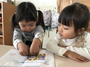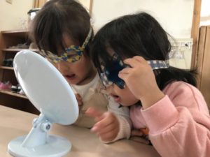 園庭で楽しそうに遊んでいた子どもたちが何やら集まってしゃがみ込んでいます。「なにしているのかなぁ?」っと覗いてみるとそこには小さな虫。その虫は園庭を歩き始めました。すると・・・子どもたちはその虫を後ろから追いかけていきます。追いかけていた虫が飛ぶと、子どもたちは「まって~」っと追いかけていました。一生懸命追いかけたのですが・・・残念ながらどこかへ。その後子どもたちはお部屋に戻ってきました。靴や帽子を片付けると本棚から絵本を持ってきて見入っています。「めがねがね」という絵本を開いて「このめがねがいい」「どれがすき?」などと話込んでいました。そのような姿にいつものおもしろめがねを用意してみました。「きらきらひかる~♪のめがねがいい」「これかして~」っと好きなデザインのめがねを選んで試着会が始まったようです。どれが似合うかなぁ~っと様々な形のめがねをお試し。お試しする度に鏡を覗き込んでチェック!!みんな素敵なメガネがとってもお似合いでした。別の机では井形ブロックで遊ぶ子もいます。井形ブロックを面白い形に繋げ、出来上がったものはまるでデザイン住宅。作っていた2歳児の子は出来上がると「ほら、できた!できたよ~、みて~」っとお披露目。「すごいね~」なんて友だちに言われとっても嬉しそうでした。お部屋の様々な場所で色々な遊びが展開し、どの子もみんなとっても楽しそう。今年度残すところ来週の月曜日1日。子どもたちの笑顔溢れる1日になるようそっと見守りたいと思います。