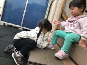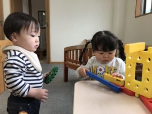 おやつを食べた後は、ブロックや絵本など好きな物を選んで遊びに夢中のなっていました。色々な物に興味を示しお友だちが遊んでいる姿を真似ておもちゃに手を伸ばしてみたり、中にはBブロックを高く積み上げ大きな建物を作っているお友だちの姿もあります。高くなるブロックに段々と手が届きずらく苦戦しながらも、一生懸命腕を伸ばし積み上げていくと大きな建物が机いっぱいに出来上がっていました。