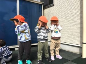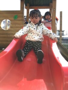 新しい環境になかなか慣れず泣いている姿もありますが、少しずつ保育に興味を持ち始めている子どもたち。園庭を元気いっぱい行ったり来たりと走ったり、「ててつなごう」とお友だちと手を繋いだり、好きな音楽が流れると曲に合わせて手を叩いたり体を揺らしたり楽しそうな姿が見られます。中でも元気に踊っていたのが”しあわせならてをたたこう”です。音楽が聞こえてくると、手を叩いたり足踏みをするお友だちがいると、その姿を見ていた周りのお友だちも真似っこ。「○○ちゃんもやる!」とほっぺたをポンポンと叩きにっこり笑顔。とっても楽しそうでした。