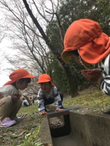 園庭で遊んだ後は、園周辺をお散歩してみる事にしました。お散歩先に到着すると、そこには桜の木いっぱい。8分咲きくらいの綺麗な桜を見ると、「わぁ~おはな!」「ぴんくだね~」とみんな上を見上げ桜の木に見入ってしまうくらいでした。満開の桜の坂道を行ったり来たりと走っているうちに、「どんぐりあった」「あ!はっぱ!」と木の実や葉っぱ、石など魅力的な物がいっぱい!みんな嬉しそうな表情で、自然に触れたり、小さな溝を渡ってみたりとっても楽しそうです。そんな中「あ!きいろ!」と黄色いお花を発見。「たんぽぽだ~!」と沢山のたんぽぽに興味津々です。「おはなかわいいね~」と優しく撫でてみたり、元気がないタンポポを見つけると「たおれちゃってる!がんばれ!」と一生懸命手でタンポポを支えてみたり。いろいろなお花に夢中になる子どもたちでした。