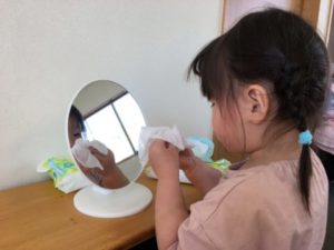 鏡を見ながらふきふき。