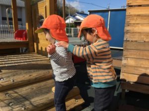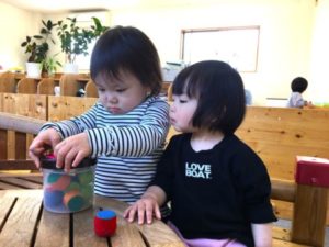 「ガタンゴトーン」「でんしゃしてるの」とお友だちと電車のように連なりながら楽しそうな声が聞こえてきます。「○○ちゃんもやる?」と一人遊びをしていた子も、少しずつお友だちとの関わりが見られるようになってきました。「ててつなご」と手を繋いでみたり、泣いている子がいると撫でたりティッシュを渡してあげたり。「これわすれてるよ!」と帽子や靴を履かせてあげたりなどなど、日々子どもたち同士で協力し合いながら過ごす姿にほっこりします。