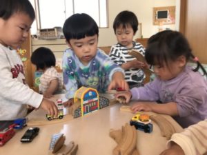 本棚から絵本持ってきてじっくりと見入る姿があり、そこへお友だちもやって来て「これ、きいろだ」「しろもある」と絵本に描かれているイラストの色に興味を示したようです。色のカードを出してみると色のカードを1枚ずつめくり自分の好きな色のカードを探していました。好きな色のカードが見つかると「あった!あったよ!」と大喜び。色のカードをめくりながら「どんないろ~がすき♪」と歌い出す子の姿も見られました。このような子どもたちの姿から「どんないろ~がすき♪」の音楽を流すとみんな楽しそうに歌っていました。色のカードを友だちや保育士の所へ持ってきて「どれがすき?」と聞きに来てくれる2歳児の子もいます。自分の好きな色を伝えるだけではなく、自分以外の人にも聞いてみようとする姿にとても成長を感じます。別の場所では消防車や救急車に興味を示している子が・・・。消防車や救急車のイラストをラミネートした物やミニカーを出してみると1台ずつ車の名前を教えてくれる子どもたち。消防車や救急車の車両の色にも話が広がっていきました。ミニカーを手に机の上を走らせています。そこへ木製のレールやお家、駅などを箱から出してみと、子どもたちは協力し次々とレールを繋げていきます。駅やお家もセットし、ミニカーを円になったレールの真ん中に綺麗に並べていました。どうしてならべてるのかなぁ?っとその先を見ていると、どうやら駐車場の様です。綺麗に並んだミニカー、それぞれ子どもたちの手によってレールの上を「ブ~ン!!」などと効果音もつけながら楽しそうに走らせていました。別の場所では飼育ケースにくぎ付けの子がいます。よーく見てみると、カブトムシの幼虫がケース越しに見えているのです。それを見て「あ!!うごいた」「ねんねしてるね」と大興奮。ケースを机の上に降ろすと昆虫図鑑を開いて見比べている虫博士の姿が・・・。「これといっしょだよ」と友だちに教えてあげていました。まさか幼虫がケース越しに見えるとは!子どもたちは動いている幼虫に興味津々な様子でした。
