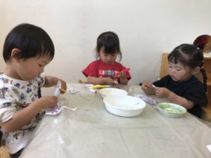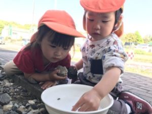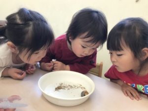 先日、透明なボトルにカブトムシの幼虫を何匹か引っ越しをした物を机の上に置いてみました。すると・・・子どもたちは先日、幼虫の引っ越しをしたことを思い出したようで「ようちゅうさんいる?」「ねんねしてるよ」などと言いながら幼虫の入った透明なボトルを手に持ち上げ底を覗いたり、ボトルをぐるり回し側面にいないか?観察し、幼虫の姿を見つけ「いたいたー!!いたよー!」っと1人の子が声を発すると・・・みんなその声に集まって来ました。子どもたちは興味津々です。カブトムシの幼虫がいる飼育ケースと霧吹きも机の上に置くと「シュッ、シュッしたい!」と。飼育ケースの蓋を開けるとみんなで交代しながら霧吹きをし、お世話をしてくれています。幼虫の入った透明なボトルの何も入っていない物を机の上に並べると、先日の幼虫引っ越しを思い出したようで「ようちゅうさんいれる!」と。幼虫引っ越しの用意を始めると「やるやるー!」「やりたい!」と意気込んでいます。昆虫マットを入れ、霧吹きで昆虫マットを湿らせ、幼虫をボトルの中へ。ボトルの上からみんな覗き込み、土の中に潜っていく様子を観察していました。「あ!はいってった!」と。幼虫が土の中へと潜っていく様子がとても新鮮だったようで釘いるように見入っていました。子どもたちの昆虫熱は冷め止まぬ様です。昆虫の写真カードを用意すると、その中でもダンゴムシは大人気。園舎裏でダンゴムシを探してみることにしました。石をどけると、いるではありませんか!念願のダンゴムシ。捕まえトレーの中へ。久しぶりの再会に子どもたちは大喜び。トレーから迷路へと移動させると行ったり、来たりするダンゴムシの様子をじっくりと観察していました。昆虫への興味は増すばかり。今後の展開が楽しみです。