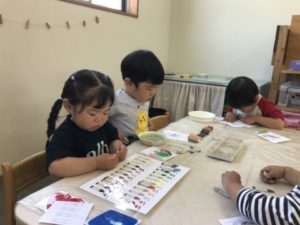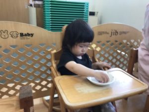 「どんないろーがすき?」「あか!」などと音楽が流れてくるといつも大きな声で歌っている子どもたちです。そんな様子から今日はクレヨンの絵のラミネートや色のカードなどを掲示してみました。それを見つけたお友だちはさっそくそこから取ってきて机に並べてみたり、クレヨンの形に切ったカードとクレヨンの絵のシートを合わせて「どれかなぁ?」「これ同じだよ。」と同じ色を合わせて遊ぶ姿が見られました。クレヨンを使ってお絵描きをしましたが、クレヨンのカードの方を持ってかこうとする子がいたのでどうするのかなぁ?と見ていると「あれ?かけないねぇ~」と笑いながら言っていましたよ。紫を見て好きなキャラクターと同じ色と言う事をお話する声もきこえてきたりもしました。別の場所ではボタンのついている玩具を用意してみました。保育士のスモックのボタンをみて「ボタンできるよ!」と言いながらボタンをはめてあげる事も多くなってきた最近の様子です。指先も器用になってきて小さなボタンでもじょうずに穴に入れることができる二歳のお友だちです。真剣な眼差しで遊ぶ様子が印象的でした。