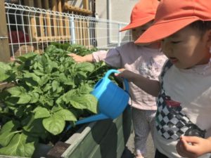 花壇のお花にお水もあげました。その際にたくさんの蟻を発見!「ありさんいっぱいいるよ。ありさんの巣だ!」とじっくりと観察していましたよ。