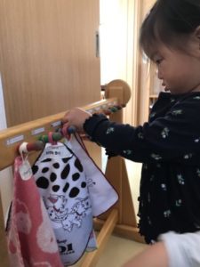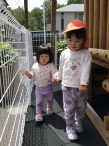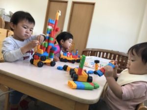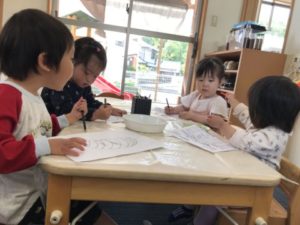 長い連休も明け、ニコニコと笑顔で登園する子、元気に「おはよー!」と言う子、お家の方と一緒に過ごしたお休みが楽しかった様で離れ際にちょっぴり涙する子と様々な姿。「あのね・・・どうぶついったんだよ」と、お休みにお出掛けをした話をしてくれる子もいます。さて、今日は朝から動物の話で盛り上がっていました。そのような姿から動物に関するアイテムを用意してみることに。写真カードやイラスト、動物図鑑などを用意してみたものの・・・「あれ?」何だか盛り上がりません。子どもたちから動物の話が出ていたのですが・・・お話だけで満足だった様です。園庭でダンゴムシを見つけお部屋の中へ。トレーの中に入れるとあちらこちらへと歩き回るダンゴムシ。その動きがなんとも面白く子どもたちはトレーを囲んで見入っていました。動き回るダンゴムシを手の平に乗せ、観察をする虫博士。いつものダンゴムシ迷路を取りに来てダンゴムシを迷路の中へコロン。壁にぶつかりコロリン・・・コロコロ。ひっくり返ったダンゴムシを「こけた!」などと言いながら起こしてあげる優しい子どもたちの姿が見られました。ダンゴムシのイラストをチョキチョキ・・・ハサミで切った形が偶然、四角。それに気が付き「みて~、しかくできた!」と。形へと興味が広がり始めました。様々な形のイラストをラミネートした物を机の上に並べて見ると「しかく、いっしょー!」更に、ハートや三角、星などいくつかの形の名前が子どもたちから聞えて来ました。動物からはじまり、ダンゴムシ、形と興味はいろいろな物へ。子どもたちの楽しい遊びは見ているこちらが「なるほどーーー!!」っと驚かされるばかり。このような子どもたちの楽しい発想を大切に見守って行きたいと思います。