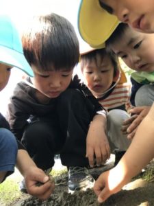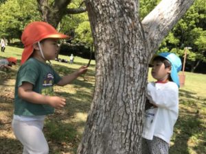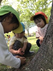 河原田保育園のお兄さん、お姉さんがバスに乗ってとまり丘保育園にやって来ました。園庭で遊んでいたとまり丘保育園の子どもたちは大きいお兄さん、お姉さんが来てくれてとっても嬉しそうです。園庭にある遊具、いつも使っている物なのですが・・・大きい子が遊んでいると何だかいつもより魅力的に感じるようで、ずっと後にくっついて真似をしています。お部屋の中では玩具を河原田保育園のお兄さん、お姉さんたちが繋げたり、並べたりし遊んでいます。アイスクリームの玩具を使って「いらっしゃいませ~」とアイスクリーム屋さんが開店。別の場所では木製のレールを繋げ、複雑な道路を作っているお兄さんたち。いつもと違うレールの繋ぎ方に惹かれ、とまり丘保育園の子どもたちが囲んでいました。さすが!お兄さんたち。優しく声を掛け一緒にレールの上に車を乗せ走らせていました。河原田保育園から遊びに来てくれたお兄さん、お姉さんたちは今日はなんと遠足。公園へ出掛けるとのことで一緒に手を繋いで貰い出掛ける事にしました。みんなお兄さんやお姉さんに手を繋いで貰い出発です!公園に着くとやっぱりお兄さん、お姉さんのしている遊びが気になるようです。傍へと寄って行き覗き込んでいました。一緒に虫探しをしたり、葉っぱを拾ったり、大縄飛びに入れて貰ったり大きい子との関わりはとっても刺激的で楽しいものだったようです。大きい子に優しくして貰い、一緒に遊ぶとてもいい経験でした。またこんな機会が訪れるといいなぁ~なんて思えた1日でした。