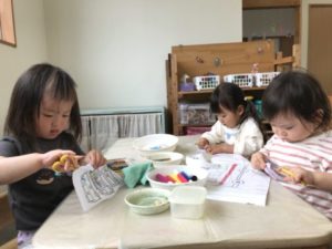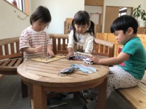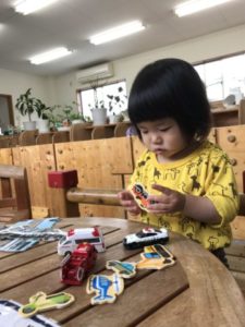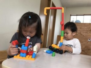 様々な形、いろいろな色のソフトブロックを見つけた子どもたちは早速、何かを作り始めました。大きくて平らなソフトブロックにタイヤを付け車のようにして遊ぶ子、細くて筒状のソフトブロックを高く積み上げて行く子など、子どもたちは様々な物を想像しながら遊びを展開させていきます。ソフトブロックで作った車のような物に人型のブロックを乗せ「しゅっぱつしまーす!ブ~ン・・・」っと言いながら走らせている子がいます。そこへ1人お友だちがやって来ました。後からやって来た子は細長いブロックを高く繋げ、それをどうするのかなぁ?っと見ていると・・・なんと友だちと合作。友だちが作っていた車と合体しました。友だちと「ちやう!(ちがう)ここじゃない!」などと言い合う場面も見られます。それでもケンカになることはなく「ん~・・・ここ?」などと2人で話し合う姿があり見ていてとても成長を感じる一コマでした。ソフトブロックを使ってとっても面白い車が沢山出来上がっていくではありませんか!子どもたちのこのような姿から乗り物に関するアイテムを出してみることにしました。そこには子どもたちが大好きな救急車や消防車もあります。救急車や消防車のミニカーやイラストをラミネートした物を「これ、いっしょだよ」「あか!」「きゅうきゅうしゃはしろ」などと色へも広がっていきました。色に関するアイテムを更に追加。クレパスや水性ペン、クーピなどを準備すると・・・「ぬりぬりする~」っという声が。救急車や消防車のイラストに色を付け「できた!!」っと満足気。「はしゃみ(はさみ)ちょうだーい!」次々と展開し、広がっていきます。イラストをチョキチョキ。器用に切り抜き、またまた満足気。それを見て「チョキチョキちょうだい!」と伝えに来る子もいました。友だちの姿を見て「やってみたい!」と思う気持ち。そんな気持ちが子どもたちをきっと成長させているのでしょう。このような姿を大切に見守っていきたいと思うステキな1日でした。