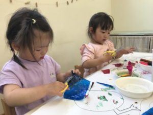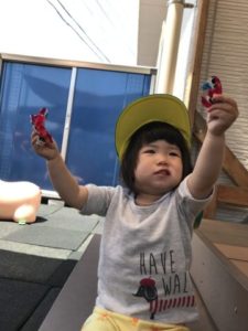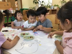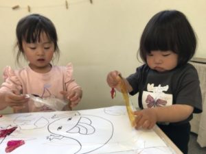 前日、働く車で大盛り上がり。そして今日は朝から園舎の横をサイレンを鳴らしながら走って行く救急車に大喜び。救急車の姿が見えると「きゅうきゅうしゃー!!!」っと言いながら何故か?みんなピョンピョンとジャンプをするのです。子どもたちのこのような姿から今日も働く車に関する写真カードやイラストを掲示してみました。すると・・・写真カードやイラストを手にはするものの、それほど盛り上がりません。働く車の写真カードを机の上に並べ「おまつりおばけ」と言う絵本を開いて見ている子がいました。絵本に出てくるおばけ・・・怪しい人がやって来て捕まってしまい、様々な色を塗られ風船にされてしまうと言うお話なのです。それを見て「だれかきたよ」「どぼろう(どろぼう)じゃん!」と。「おばけ・・・ないちゃった」「あかになったよ、おばけ」と、子どもたちの会話。今日は「おばけday」の様です。おばけに関するアイテムを掲示したり、おばけのイラストを子どもたちの目の前で描いてみました。舌を出したおばけを描いてみると・・・子どもたちはおばけのイラストの真似をし舌を出し「べぇ~」そして両手を上げたおばけの真似っこ。真似っこ遊びが始まりました。別の子からは「ぬりぬりしたい!」なんて声も聞えて来ます。子どもたちからリクエストのあったアイテムを用意すると・・・・次々と遊びを展開させていきます。色のアイテムは塗るだけではありません。カラーセロハンも出してみました。すると「ハサミちょうだーい!」更なるアイテムを求め、渡すと・・・カラーセロハンはハサミで切りにくく大苦戦。ハサミの刃先をゆっくり、ゆっくり動かし切る事が出来ると「きれたーー!やったー!!」っと、とっても嬉しそうでした。ハサミを使わず両手でギュッとセロハンを引っ張り切っている子もいました。子どもたちそれぞれが色々な事を考え、実行していく姿はとてもたくましく、成長を感じます。大人が直ぐに手を貸してしまってはこのような姿を見ることは出来ないでしょう。子どもたちの姿をじっくりと見守り頑張る姿を応援したいと思います。