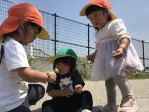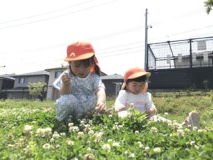 後半の時間は近くの公園にお散歩にでかけました。丸太の遊具に登ってみたり、芝生の上を走ったりたくさん体を動かし笑い声も広がっていました。シロツメクサがたくさんありそれを持って他の子に「はい!あげる!」と渡していました。シロツメクサの絨毯の上に座って遊ぶ姿はとてもかわいらしかったです。