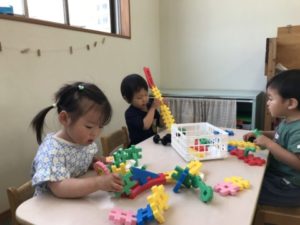 朝園庭からお部屋の中に入ってくると、おやつにいく子や遊びたい物を見つけて遊び始める子などさまざまな朝の様子が見られます。今日は大きさの違う容器を重ねて遊ぶ玩具が棚の上に置いてあったのを見つけた子が、その容器をコップに見立ててごくごくと飲み物を飲む真似が始まりました。近くの棚をカウンターにしてそこからジュースをいれて・・・これはきっとドリンクバーなのかな?と思った場面でしたよ。そんな盛り上がった様子から牛乳パックやペットボトルに色水を作っておいてみると「牛乳どうぞ~」「お茶どうぞ~」などと飲み物屋さんが始まっていました。楽しい雰囲気が広がっていましたよ。また次はどんな会話が聞こえてくるのか楽しみです。他の場所では、いがたブロックで夢中に遊ぶ様子もみられました。長く繋げて道路や線路にしたり、それを持って掃除機のようにしたり・・・「タイヤ交換してるの!」などという会話もきこえてきましたよ。