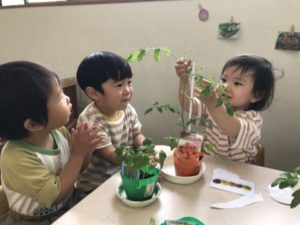 ミニトマトとオクラの苗が保育室にあり、苗の様子を毎日観察しながら「とまとのあかちゃんできてるよ」など変化に気が付きすぐに教えてくれます。以前、さつま芋やきゅうりの苗植えをしてから更に興味が深まってきているようでした。そこで、苗をもう少し子どもたちが見やすい所に置いてみると、子どもたちは苗に顔を寄せてじっくりみたり、手で触って感触を確かめる姿がありました。「とまとさん、ここにもある!」「あった。あった」と実になったトマトを見つけたり、苗と一緒に飾っておいたトマトの写真カードをみて「きいろ!」「これはあか!」と会話も弾んでいました。トマトの苗をオクラの苗と見比べて「こっちのかわいい」など大きさにも気づく声も聞かれました。そんな子どもたちの様子から、今日は野菜の苗を土に植える事にしました。スコップやバケツを準備し始めると、子どもたちはこの様子に気が付き「なになに~?」「ぼくもしたい!」といって一緒にバケツやスコップ、土をはこんでくれました。土を開けるとスコップで土をすくいプランターにさっと入れてくれます。たくさんの土でしたが子どもたちは楽しそうに「そーっとね~!」といいながらやる気満々で土をプランターの中にどんどん入れてくれましたよ。土が出来上がると苗をそっと持って穴を堀ったところに苗を入れ土をかぶせてくれました。みんなとても優しい手つきで大事に苗うえをしていました。プランターが完成すると、次はじょうろで水やりをしてくれました。じょうろを置いて、また苗の方に戻っていく不思議な姿が見られ、どうするのかな?と思ってみていると、苗の一本一本に手でタッチして「ばいばーい」「またね」とあいさつしていている姿がありました。子どもたちならではの苗を大切にしたいという気持ちが出ていてこちらも嬉しくなりました。苗と子どもたちのこれからの成長が楽しみです。
