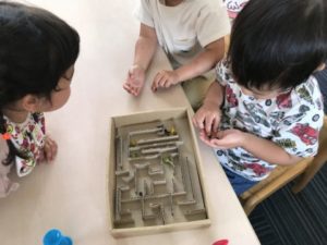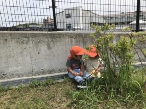 公園では芝滑りをしたり、タンポポを見つけて持って行った虫かごの中にいれたりしていました。残念ながらその公園では虫さんは見つけられなかったのですが、帰り道に寄った広場ではだんご虫を見つけることができ、たんぽぽと一緒に虫かごの中にいれて帰ってきましたよ。園に着くとだんご虫の迷路にいれて観察していました。「かわいいなぁ~~」と心の底から言っている姿にほっこりしましたよ。大好きなんだなぁという気持ちが伝わってきますね。