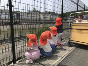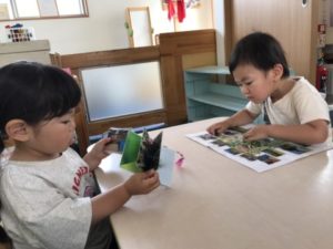 登園してきて靴をげた箱にしまうのですが、その上にはカブトムシの幼虫の飼育ケースがあり、それをみたお友だちが「わあ!!ようちゅうさん、ウニョウニョしてるよーーー!!」と大興奮な様子。土の中で幼虫が動いていたのがはっきり見えてしばらく観察に夢中でした。机の上にあった虫のカードを見てお話していた会話の中でもカブトムシ、だんご虫、ちょうちょう・・・いろいろなワードが出ていましたよ。そして一緒に置いてあったお散歩マップでも盛り上がっていて、「ここ保育園!」「ここを曲がっていくんだよ!」「ここいったことあるー。」など楽しそうな姿もありました。「公園いきたーい。」「だんご虫いないかなぁ?」などの声も聞こえてきたので近くの公園に行くことに・・・保育士がリュックを持って帽子をかぶったりした様子をみた子どもたちは遊んでいたおもちゃをすぐに片付け、靴と帽子を持って準備万端。靴を履いてお友だちと手をつなぐ姿は素晴らしかったです!