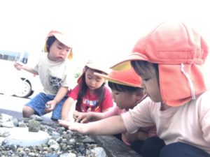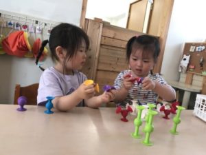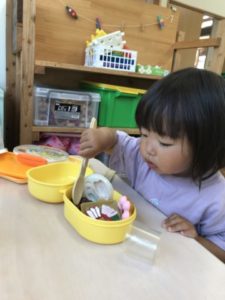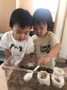 カブトムシの幼虫がいる飼育ケースを覗き込み「なんか、でてる!」子どもたちが発見しました。飼育ケースを机の上に置くと・・・興味深げに子どもたちが集まって来ました。いつもは土の中にいる幼虫。今日は土の上に数匹出て来ています。子どもたちがその様子を心配そうに見ていました。いつもと違うカブトムシの幼虫の様子が心配になり調べてみることにしました。すると・・・どうやら苦しくて出て来ているようなのです。これは大変!!応急処置をしてあげなくては!と様々な物を準備してみました。子どもたちの興味が広がっていきます。「やりたい!」と。子どもたちはカブトムシの幼虫の世話を始めました。霧吹きを持ってきてシュッシュツ!!1つしかない霧吹き、ケンカになるかなぁ~?取り合いになるかなぁ~?っと見ていると・・・「じゅんばんこね」「つぎは〇〇がしたい!」などと子どもたちは譲り合いながら世話をしてくれています。言葉でのやり取りが盛んになってきて子ども会議が始まるほど。大人の心配などは要らない様です。それでもケンカは時折起こるのですが・・・誰かが泣いていたらティッシュを運んできてくれたり、ゴミ箱を持ってきてくれたり・・・。友だちが泣いているといつも誰かが気づいてくれるのです。子どもたちのこのような優しい姿にこちらがとても温かい気持ちになります。今日はカブトムシの幼虫の世話から昆虫へと興味が広がって行き、ダンゴムシ捜索隊員の姿も。ダンゴムシを捕まえると迷路を取りにやって来ます!可愛い昆虫博士は「ダンゴムシ、おなかすいてる!」「ダンゴムシはチーズがだいすきなんだよ」と給食の先生に「チーズ、ない?」と尋ねにいくほど。チーズを1つ貰いダンゴムシに「はい!どうぞ~」「たべていいんだよ!」などと言いながらダンゴムシの様子を観察していました。