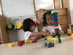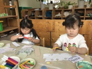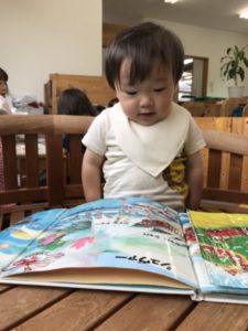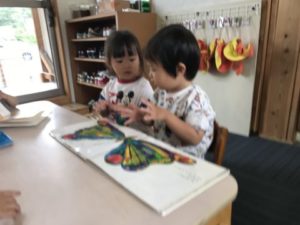 絵本が大好きな子どもたち!一日の中で必ず一回は絵本を手にし椅子に座ってみる姿があります。今朝も気づくとそんな姿が見られお友だちと並んで見ていましたよ。「ちょうちょう~ちょうちょう~なのはにとまれ~♪」と聞こえてきたので見てみるとはらぺこあおむしの絵本を見ているところでした。手でヒラヒラさせてちょうちょうを作っている姿はかわいらしかったです。他にもおばけの絵本では怖い顔のおばけが怖くて泣いてしまったり、働く車が大好きで見ては片付けて、また見たりして何度も楽しむ様子もありました。明日はどの絵本を手にするのか楽しみです。