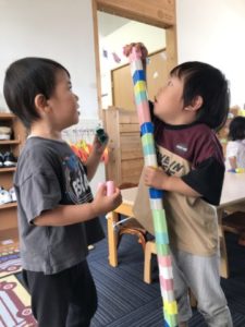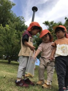 今日はなんと思いがけないプレゼントを頂きました。それは以前に公園へ散歩に出掛けた際、子どもたちが拾っていた実。その時は「ん~、なにかなぁ~?」などという会話でした。それほど興味を示す様子もなく何となく様子で子どもたちの中で広がりは見られませんでした。頂いた実はなんと・・・なんと・・・梅の実。頂いた梅の実が入った袋を机の上に置いてみました。すると・・・子どもたちのアンテナがビビビッ!!「なになに~?」「これなんだろうねぇ~」「りんご?」などと様々な声が聞こえてきます。そこで保育士が梅の実のヘタを取り始めて見ると・・・その様子をジーッと観察。「やりたい!」「〇〇もちょうだい!」子どもたちもやってみたくなった様です。「おねがいできますか?」と伝えると先ほど、保育士がヘタ取りをしていた様子を真似ていました。梅の実のヘタ・・・これがなかなかうまく取れないのですが子どもたちは夢中になりヘタ取りをしてくれています。そこで実際に実っている梅の実を見たらどのような声が聞こえてくるのか?こちらがとてもワクワクしながら梅の実探しに出発。公園内で梅の木を発見!木の下に沢山、実が落ちていました。それを見つけると子どもたちは駆け出し、落ちていた梅の実を拾い匂いを嗅いだり、両手いっぱいに拾ってみたり。「なんかにおいする」と匂いに気が付いた子もいました。実際に実っている様子を見て園に帰ってきてから頂いた梅の実を机の上に広げると「いっしょだ、うめ!」なんて声も聞えて来ました。思わぬプレゼントから今日は梅の実へと興味が広がっていきました。この梅の実、今後どうなっていくのか?お楽しみに!