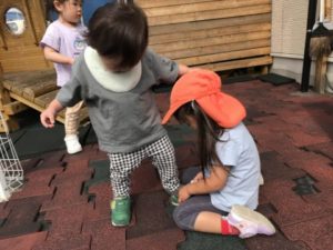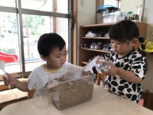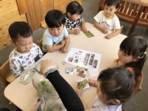 今朝、カブトムシの幼虫がお家の外側に出てしまっていたのを保育士が直していると、傍に来て一生懸命観察していました。そのうちに「動いてないねぇ~。」「どうしたんだろ?」という声が聞こえてきました。「お水かけてみる?」という言葉から水をおいてみると、隣にいたお友だちに「ここ回すんだよ。」とシュッシュするやり方を教えてくれる姿も見られ、幼虫がくねくね動きだした様子にも大興奮していましたよ。ブロックや動物の積み木などで遊んでいる中、他の机には先週プレゼントに頂いた梅の実や、びん、氷砂糖・・・などを用意してみました。その様子に気づいた子どもたちはなに?なに?という感じで集まって「うめだ!」「おにぎりにいれるやつだ!」と言いながら梅の実の写真と照らし合わせたりしていました。梅シロップの作り方の材料の中に氷砂糖があり、「どんな味かなぁ?」と聞いたところ「しょっぱいんじゃない?」と言っている子がいたので味見してみることにしました。子どもたちの反応は「あま~い!」と美味しそうな顔。味見するのをためらっていた子も舐めてみるとおいしかったようでおかわりを欲しがるくらいでしたよ。もうひとつの材料の酢も味見してみましたが、こちらは微妙な顔。「すっぱい!」という子もいて今日は甘いと酸っぱい味の体験ができました。氷砂糖いれて、梅の実いれて・・・梅シロップができるまではまだまだ時間がかかりそうですが、子どもたちと一緒に出来る日を楽しみにしたいと思います。